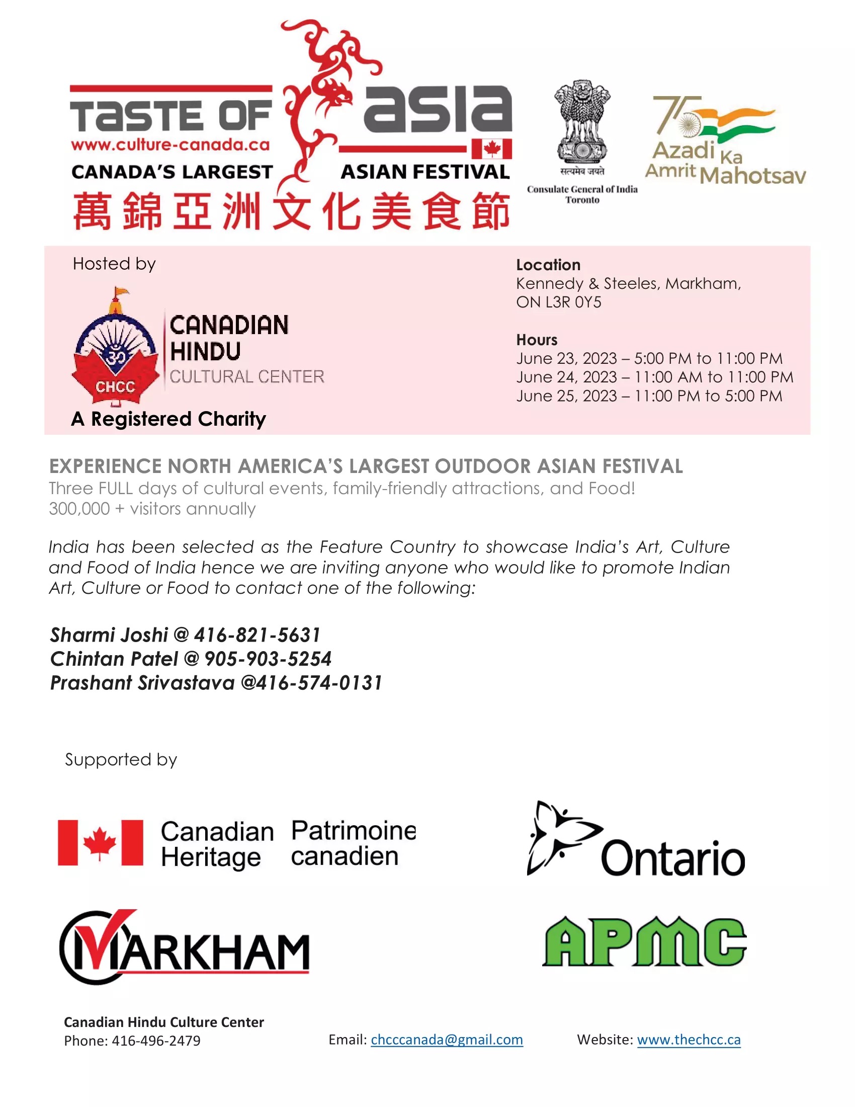 Each year, Taste of Asia focuses on a different Asian theme, and this year’s theme is “India,” highlighting the country’s culture and cuisine. The festival’s primary goal is to promote Canada’s diverse cultural heritage and to spread the message of inclusion and the elimination of racial discrimination. Canadian Hindu Cultural Center, Toronto, in partnership with the Consulate General of India will be hosting INDIA as the feature country to Celebrate 75 Years of India’s Independence known as “Azadi ka Amrit Mahotsav”