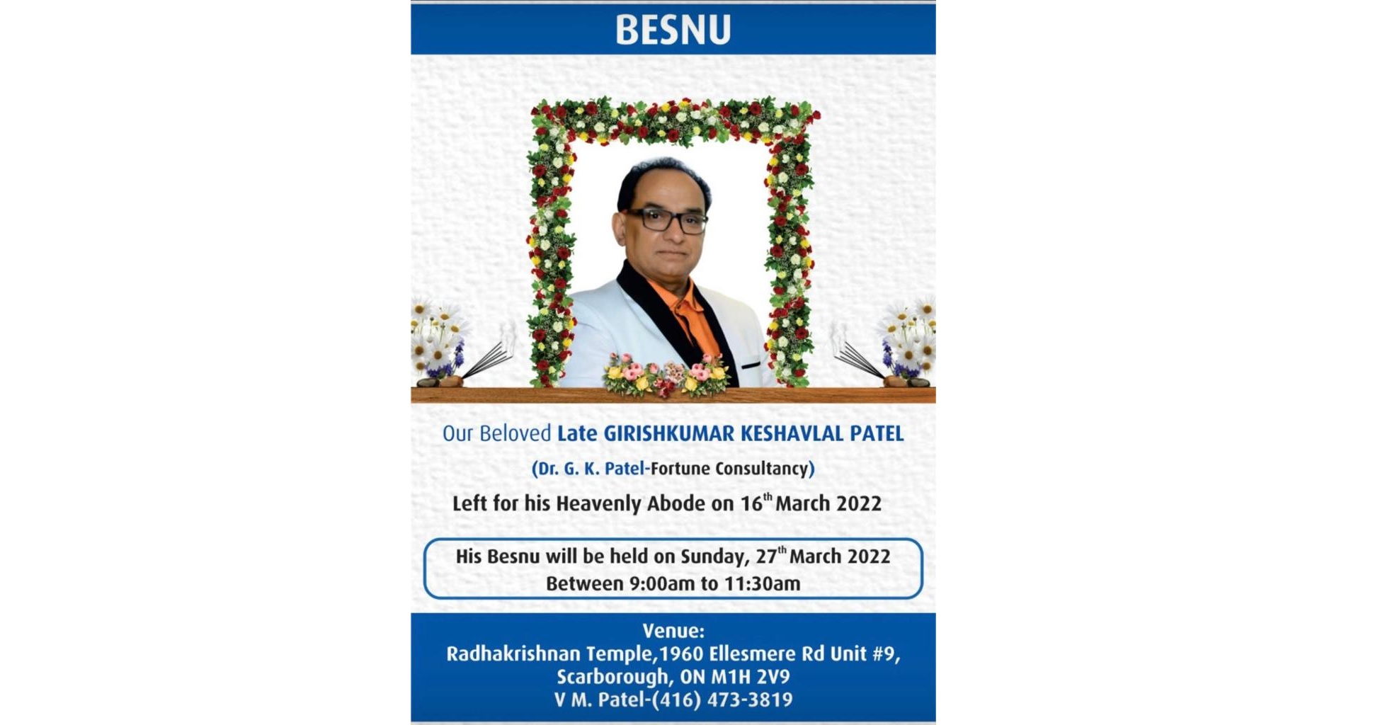 The Community will be offering their condolences at the Radhakrishna Mandir on Sunday, March 27, 2022 from 9am to 11am